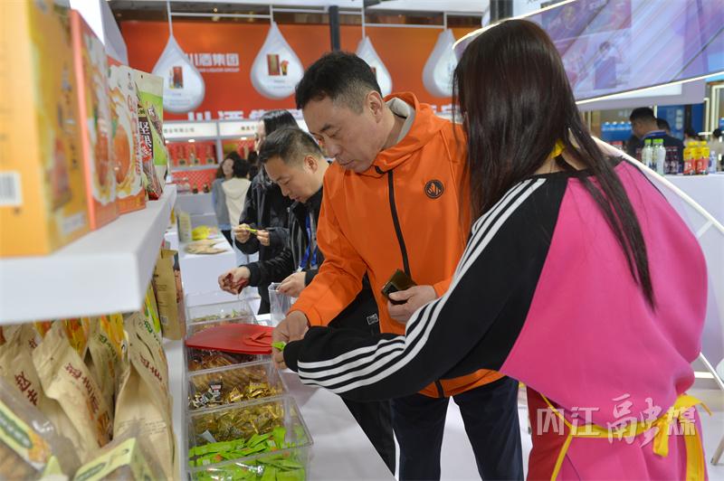 ▲3月21日,第110届全国糖酒商品交易会在成都举行。图为客商在选购内江商品。