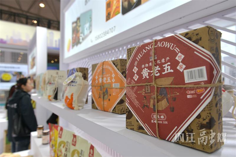 ▲3月21日,第110届全国糖酒商品交易会在成都举行。图为展销的黄老五花生酥。