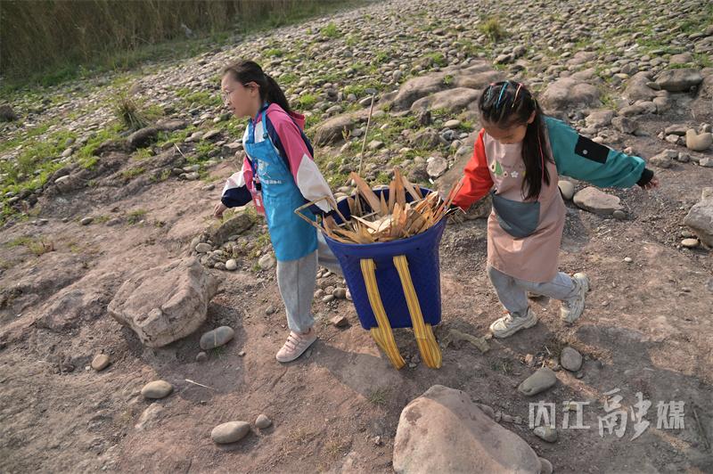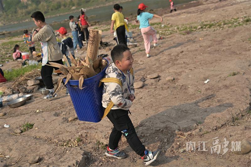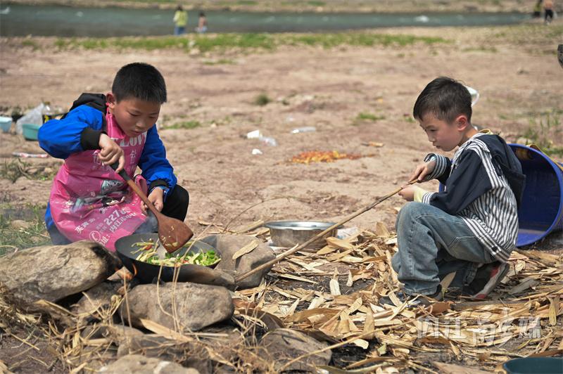 “叔叔,我想要这块鹅卵石做灶台,可是它太重了我搬不动。”“阿姨,这个枯树枝太长了,背篼装不下怎么办?”捡鹅卵石、垒灶、拾柴、取水,小记者们在村委会工作人员的带领下,进行着野炊活动的准备工作。