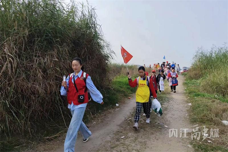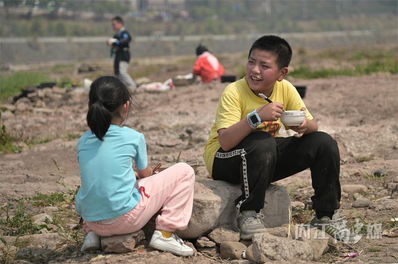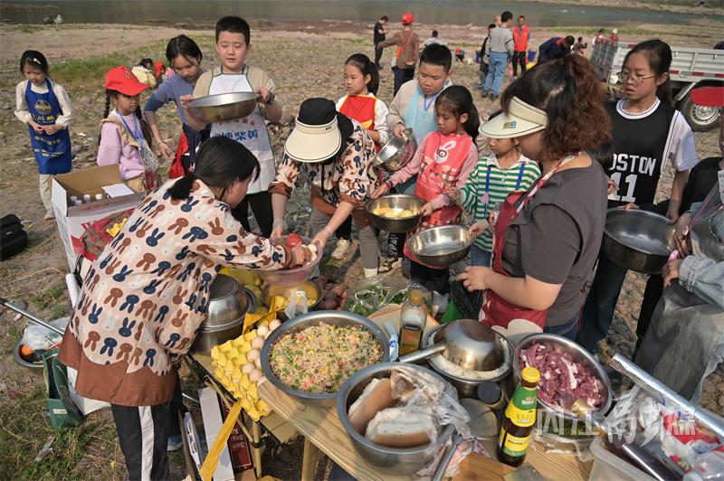 上午一大早,参加活动的小记者们便自带锅、碗、瓢、盆、菜板等烹饪工具,统一乘坐大巴从内江日报社出发,经水心坝大桥来到水心坝村,在村委会工作人员和工作室老师的带领下,小记者们徒步到水心坝村码头河滩野炊点。