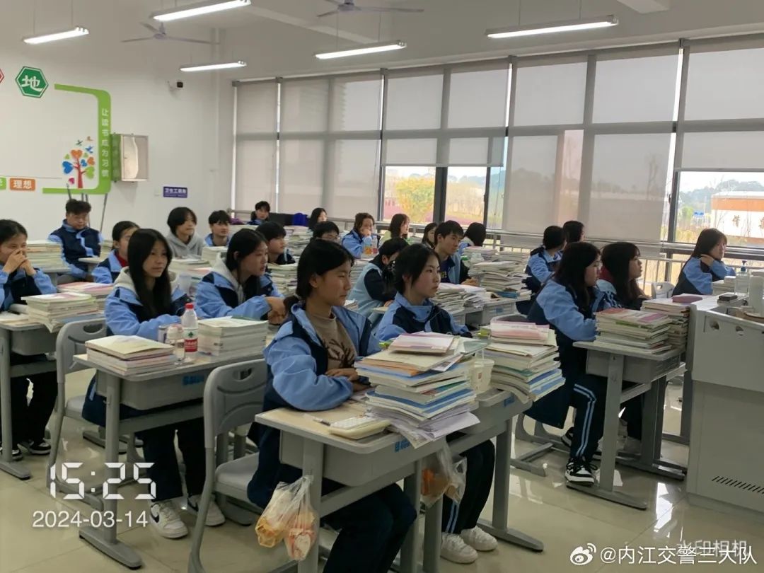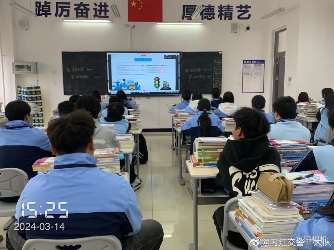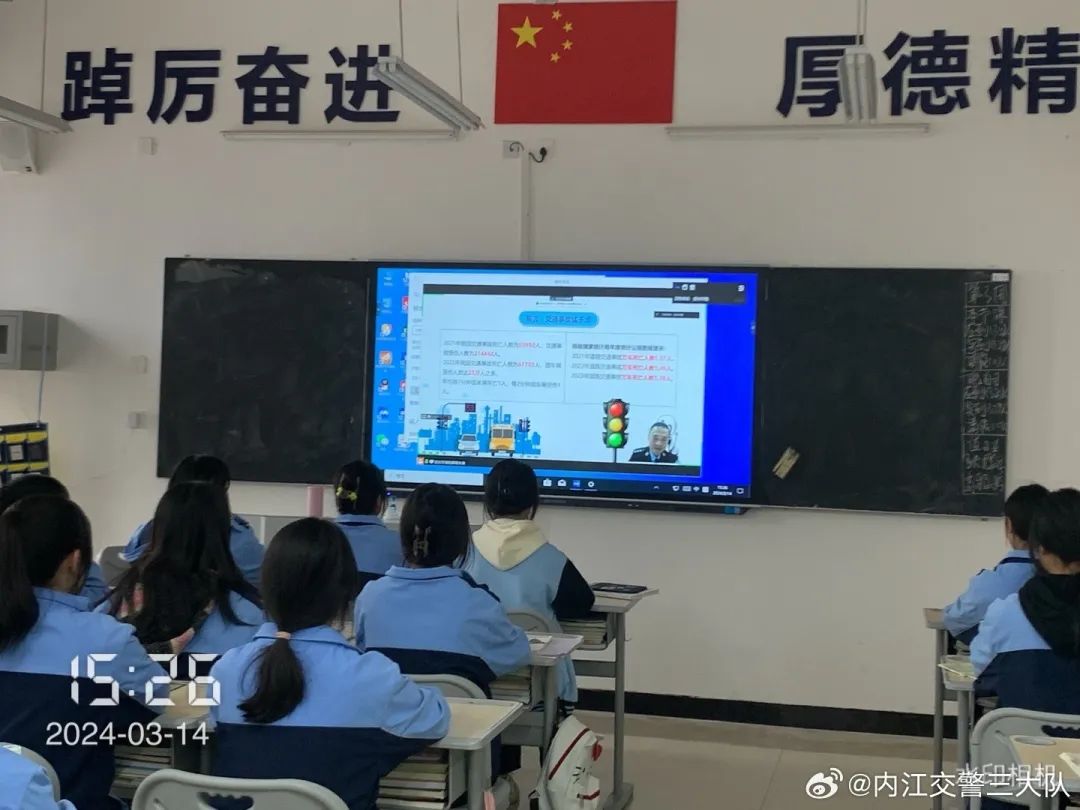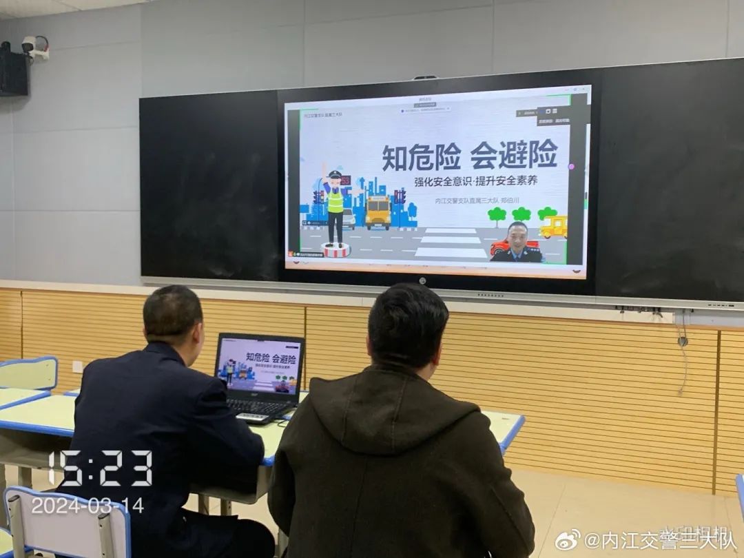 2024年3月14日下午,内江交警直属三大队走进内江市高级技工学校,采用网络授课的形式为全校三千四百余名师生上了一堂别开生面的交通安全宣传课。课堂上,宣法民警围绕校园周边交通安全现状及学生日常出行特点,深入浅出地向同学们讲解日常出行时应注意的安全事项。并播放交通事故警示教育片、结合典型交通事故案例进行讲解,引导学生们在日常出行中牢固树立交通安全意识,养成良好的出行习惯,真正做到“知危险 会避险”,全面提升自我保护意识。