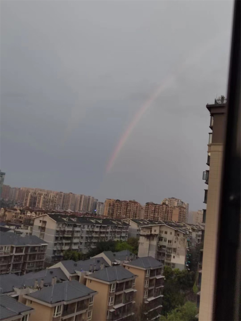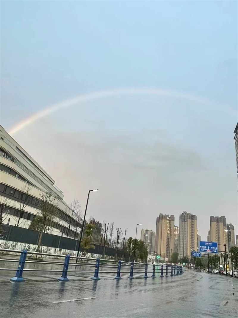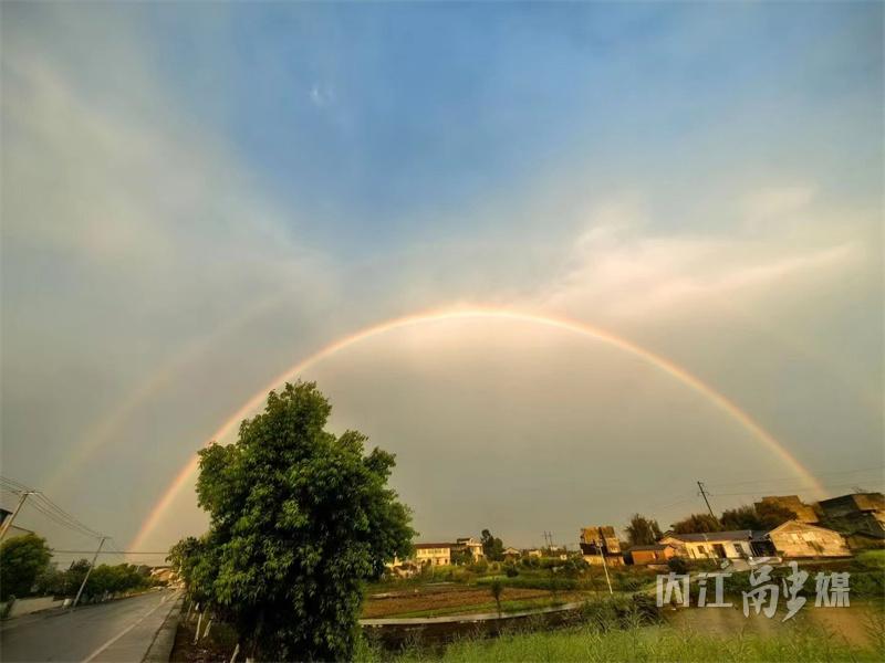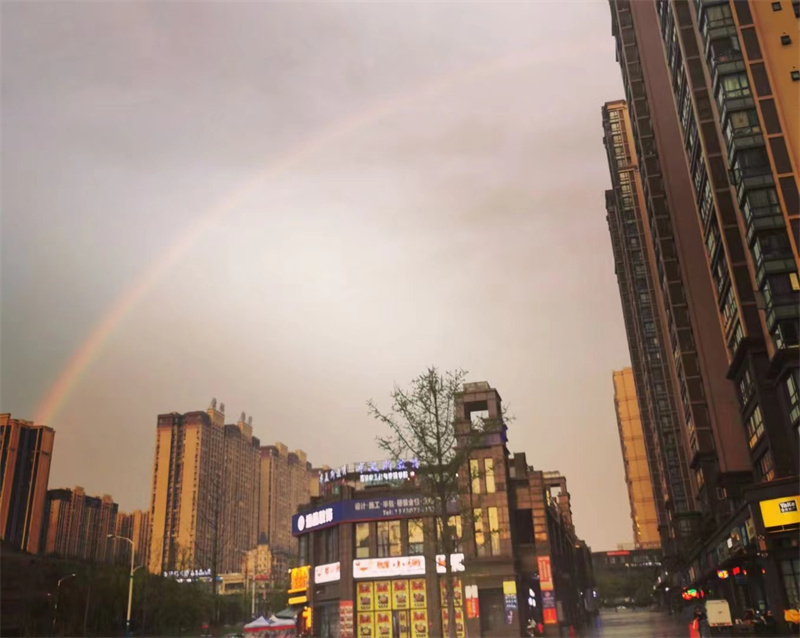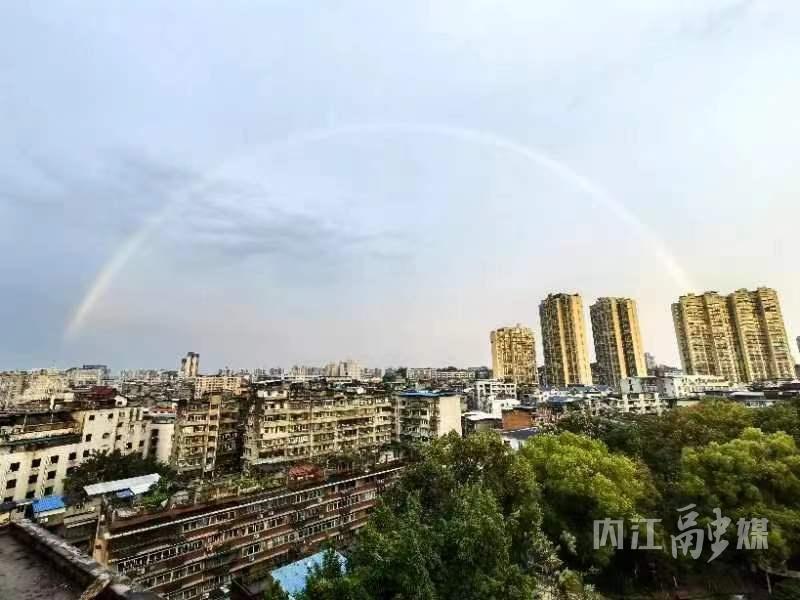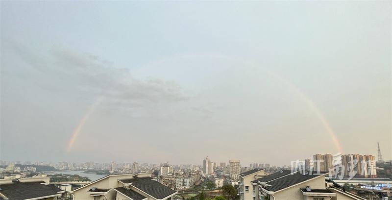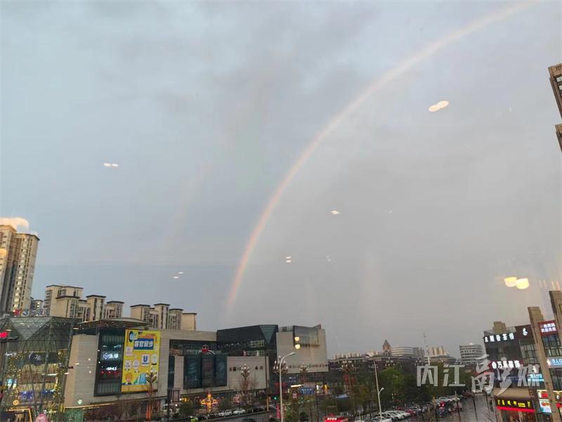 3月27日傍晚,一场阵雨席卷甜城大地。晚7时许,降雨的间隙,短暂的夕阳余晖乍现,一道彩虹出现在天际,红橙黄绿青蓝紫,七色彩虹瞬间刷爆内江人的朋友圈,一起来看看吧——