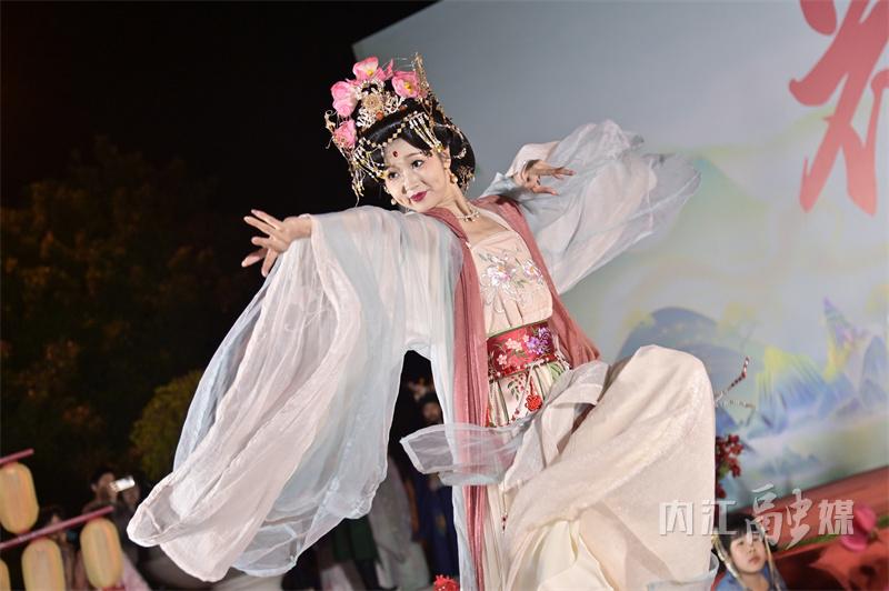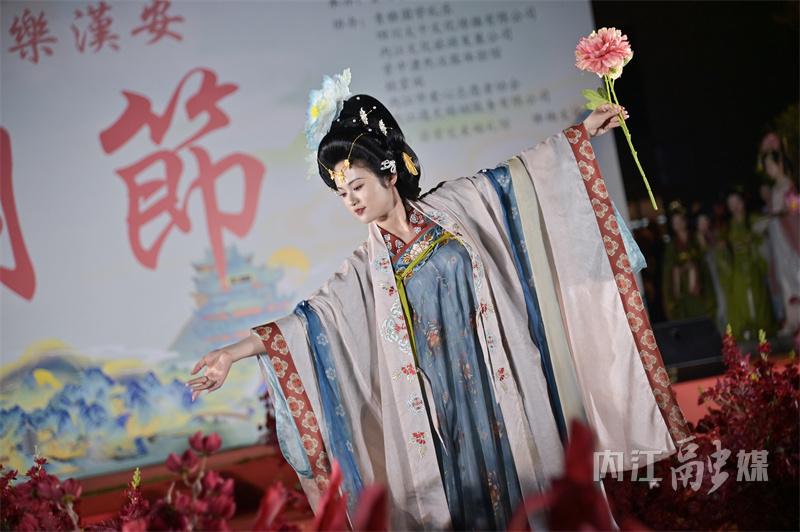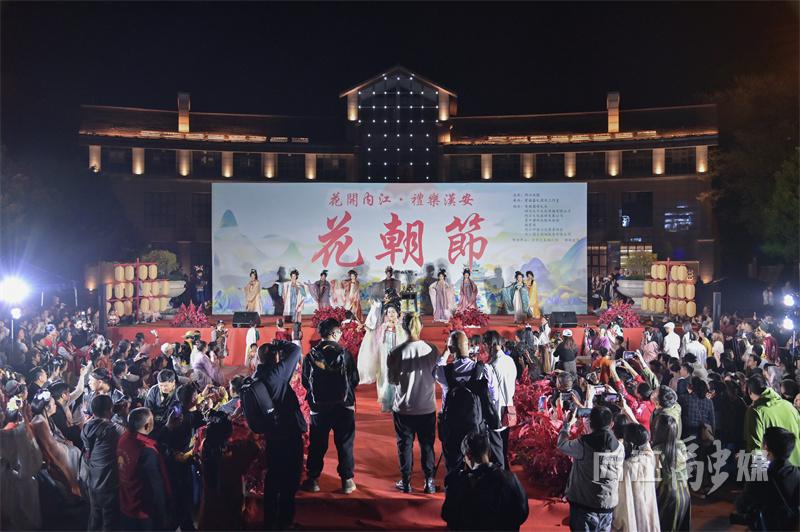 3月30日晚,内江市东兴区大千园灯光璀璨、热闹非凡。2024年“花开内江·礼乐汉安”花朝节汉服主题文化活动在此举行,吸引了众多市民和汉服爱好者前来围观。