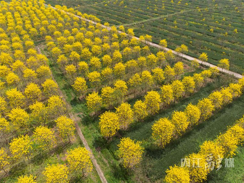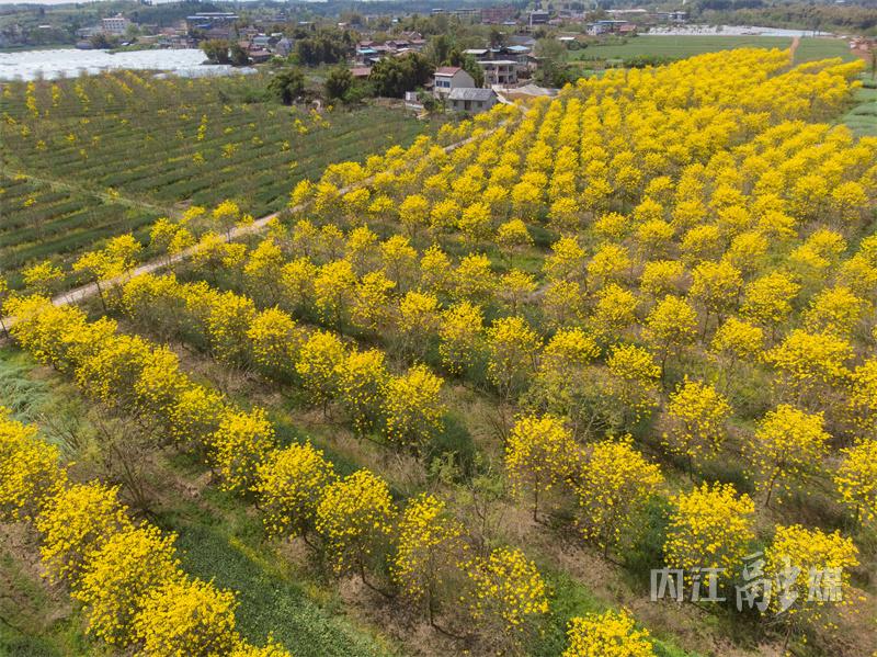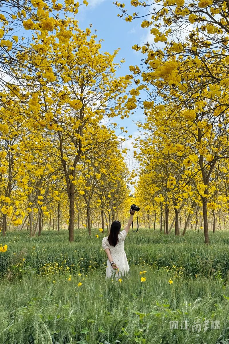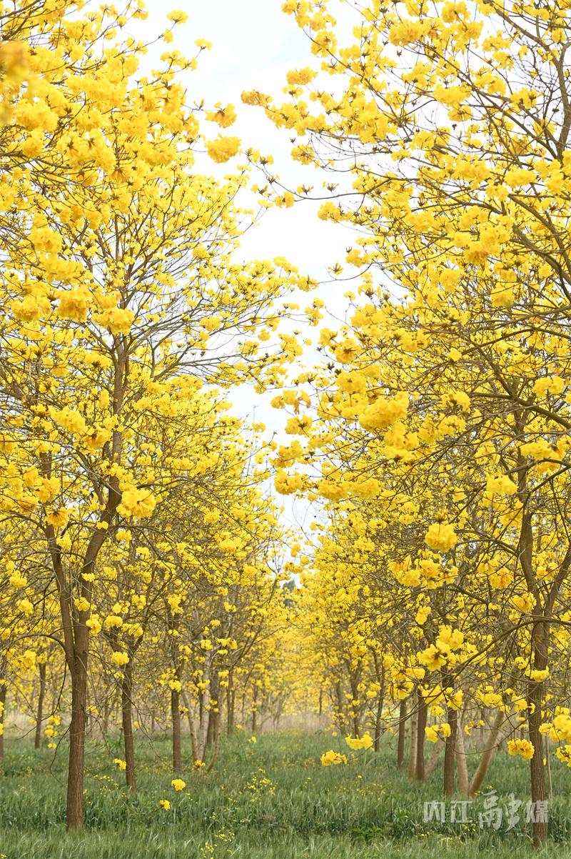 连日来,石子镇太和村苗木基地内种植的黄花风铃木迎来盛花期,金黄色的花海在蓝天白云的映衬下格外耀眼,构成一幅动人的乡村田园画卷。