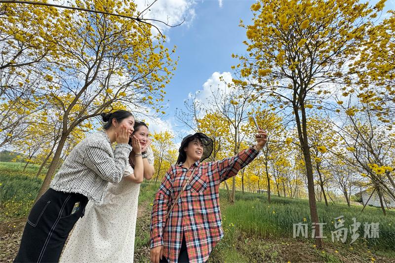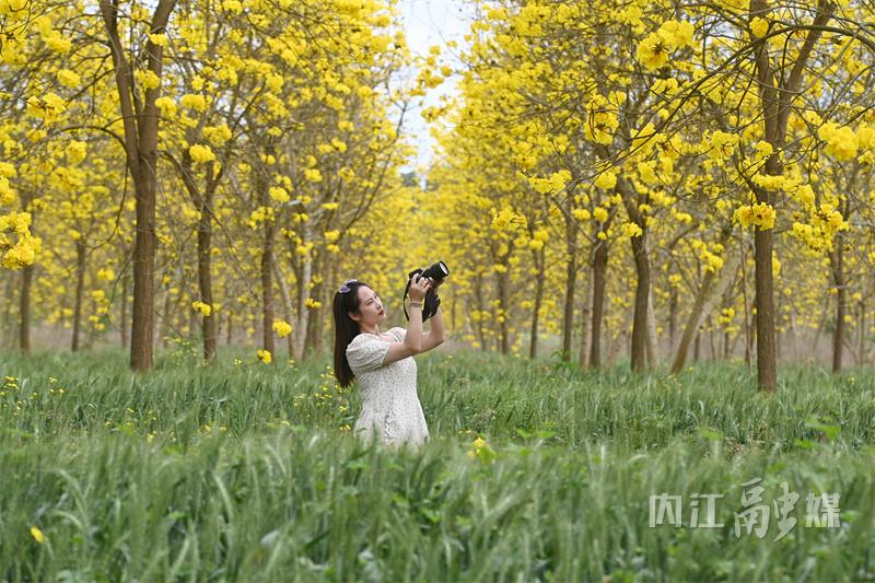 4月2日,内江市东兴区石子镇太和村,游客在苗木基地内观赏黄花风铃木。