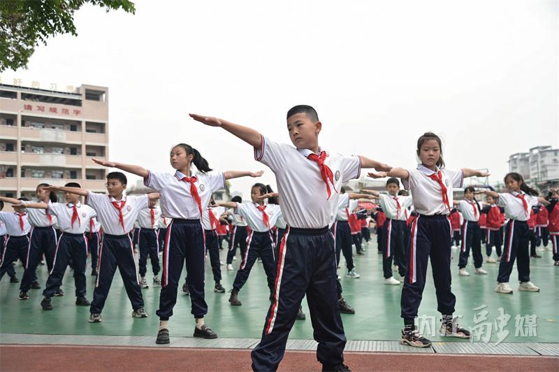 活动现场,各班学生身着整洁的校服,迈着整齐的步伐,喊着响亮的口号,同学们以班级为单位,以年级为方阵进行比拼。伸臂、扩胸、转体、弯腰、跳跃,同学们认真完成每一个动作,整齐划一的动作、青春洋溢的脸庞绽放出运动的活力光彩,体现了当代小学生朝气蓬勃、阳光快乐的精神风貌。