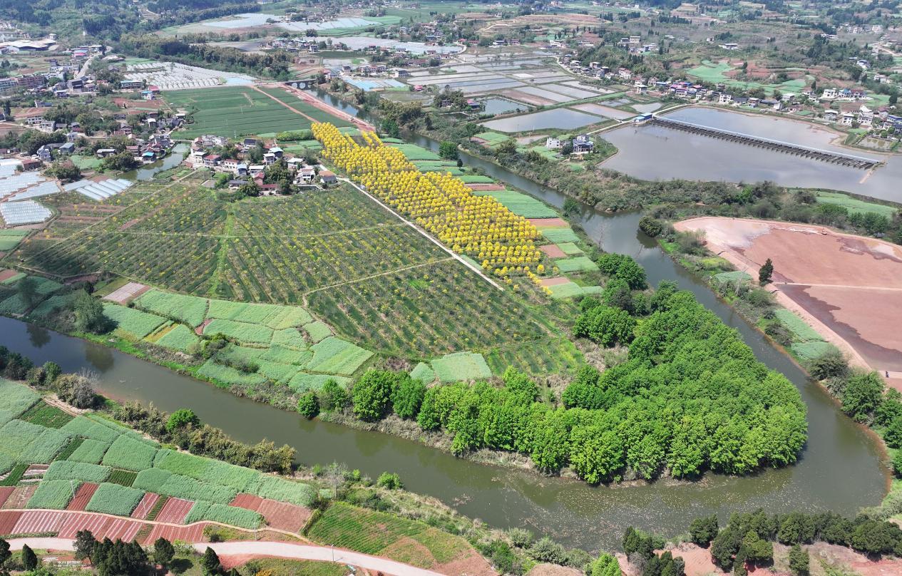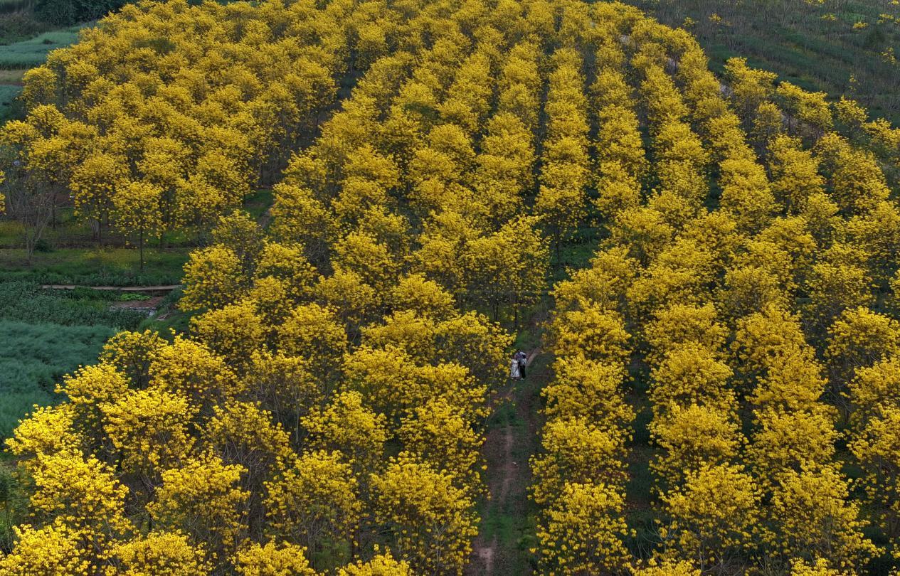 4月2日,在内江市东兴区石子镇太和村,金黄的黄花风铃木在春日的暖阳下熠熠生辉,与周边农田、村庄共同构成了美丽的乡村画卷。