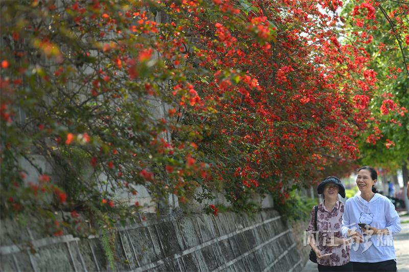 市民在三角梅下拍照