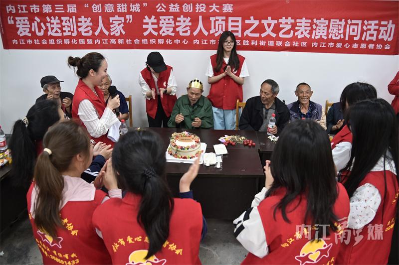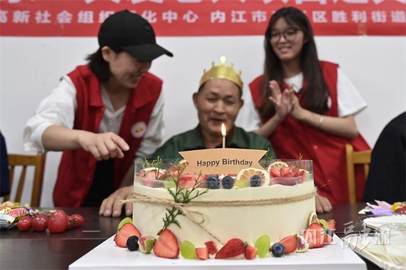 “吴叔叔,听说昨天是您64岁生日,我们今天特地来给您补一个,给您一个惊喜!”志愿者邓延聪为吴元德端上一块蛋糕。