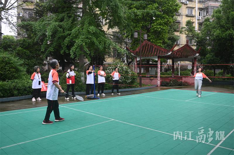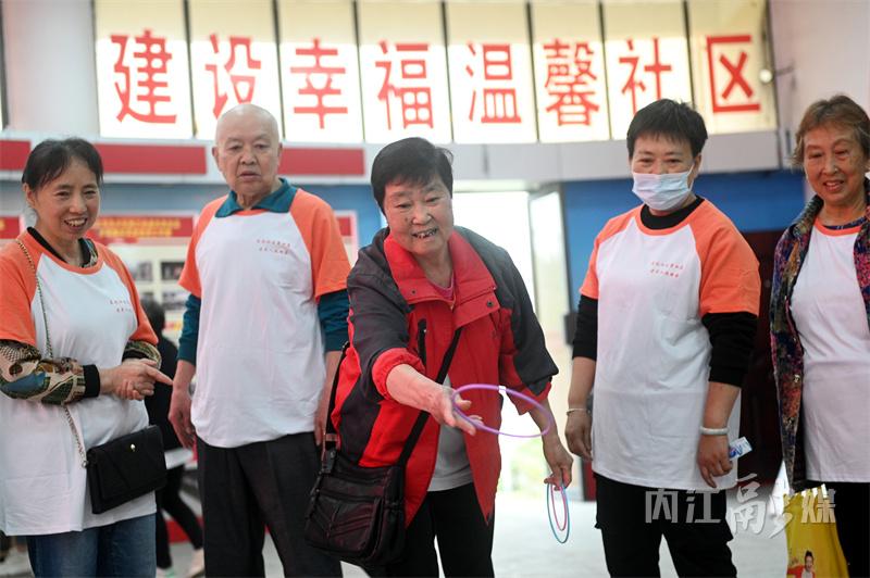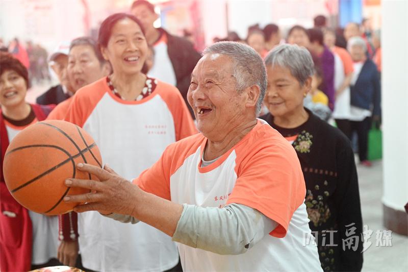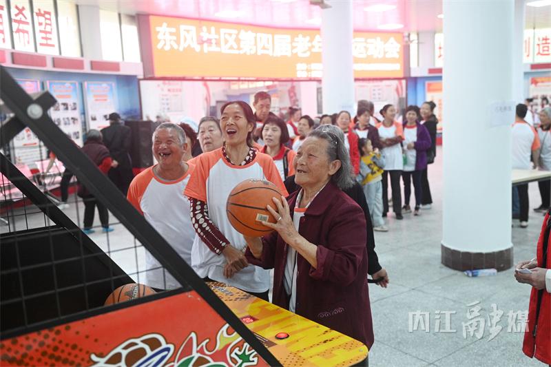 4月25日,内江市东兴区新江街道东风社区党群服务中心,老年运动员在参加定点投篮项目比拼。