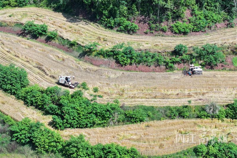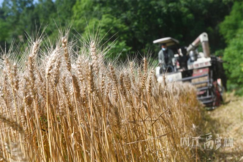 走进内江市东兴区宏展粮油专合社的小麦种植基地,只见金黄色的麦田随风泛起阵阵涟漪,麦浪一层接着一层,俨然一幅美丽的田园“丰”景。一台台收割机开足马力在金色的麦浪中来回穿梭,收割、脱粒、装车等作业有序进行,麦田一派忙碌的丰收景象。