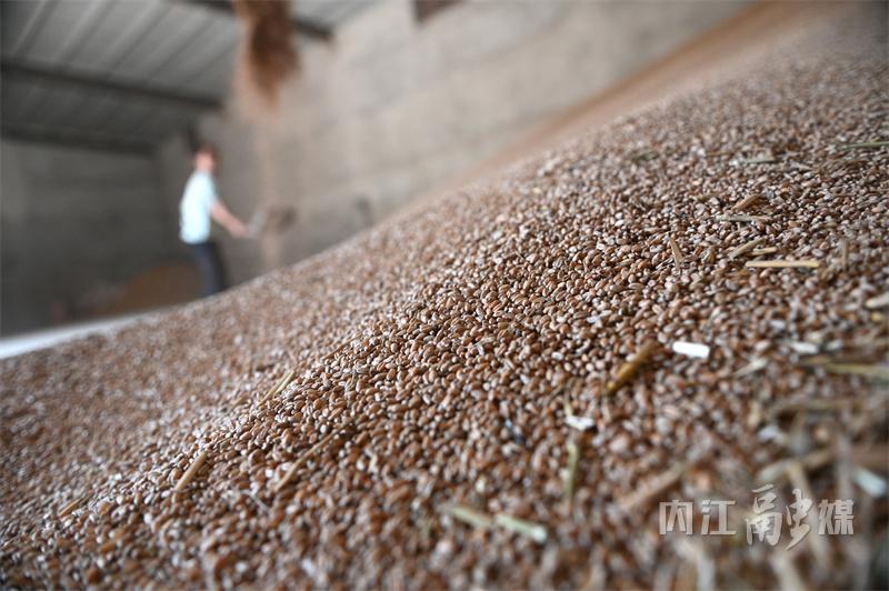 在专合社专门建设的烘干加工房,新鲜收获的小麦正烘干归仓。“今年对烘干设备进行升级,使用燃气作为原料进行加工,满足绿色环保的同时提高加工效率,一天可以烘干一百多吨的小麦,可以保证小麦水份低于12%,利于储存。”内江市东兴区宏展粮油专合社负责人胡洪兵介绍道。