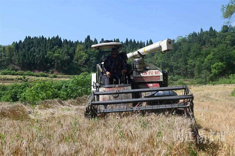 4月27日,内江市东兴区石子镇龙安村,农技员驾驶收割机收获小麦。