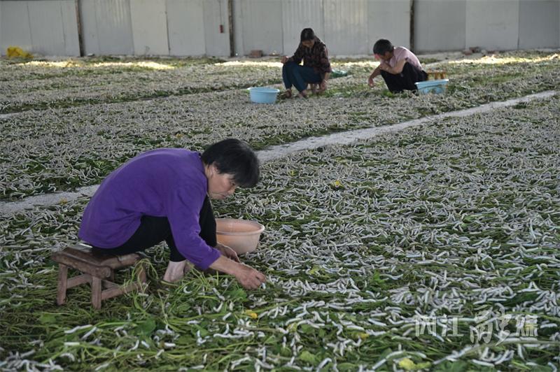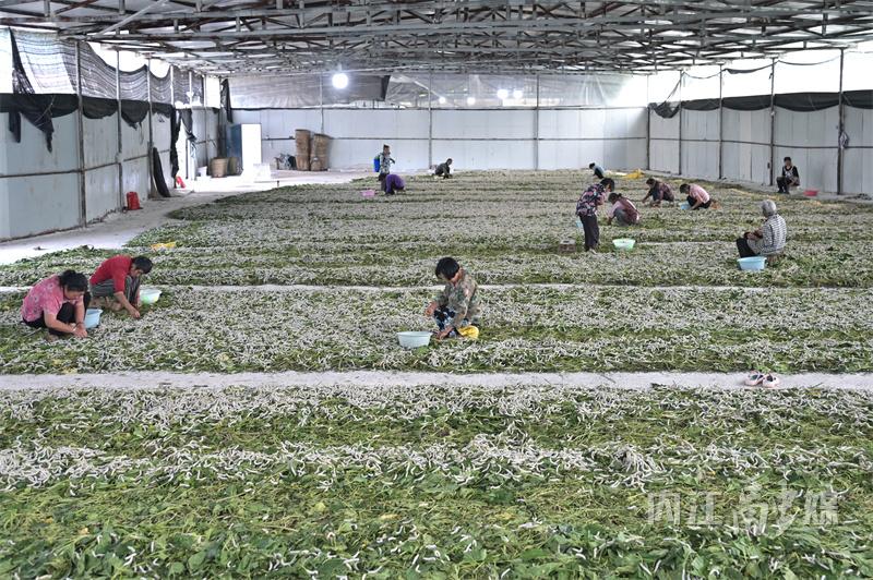 记者看到,宽敞明亮的养殖大棚里,工人们一人一盆,有序配合,将僵蚕从桑叶中分拣出来,装筐摊晾等待第二天公司上门收购。