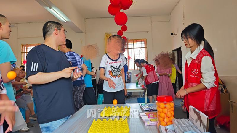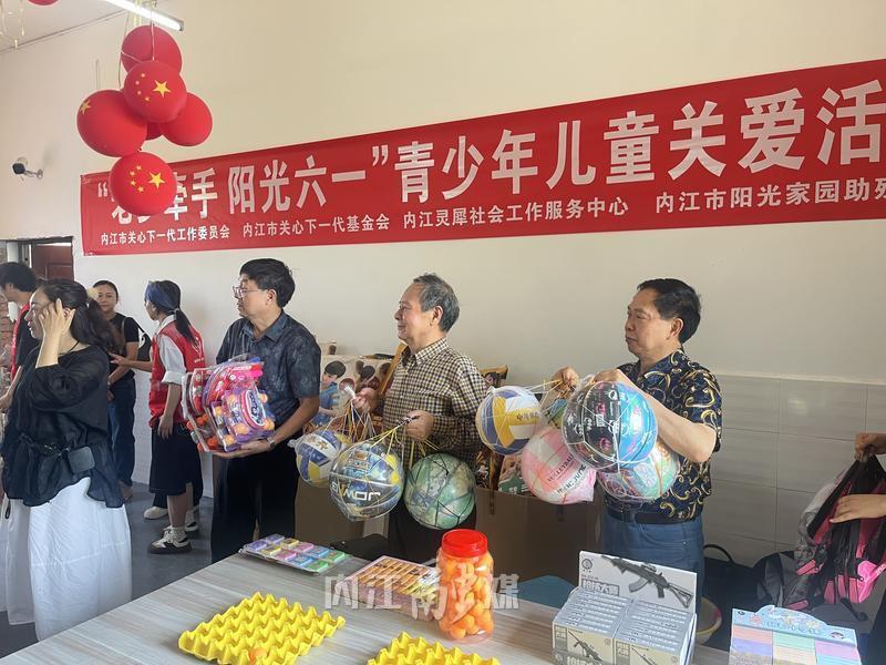 活动中,内江市“五老”志愿者走进内江市阳光家园助残中心,向该中心捐赠了一批篮球、排球、乒乓球拍、羽毛球拍等体育用品,并为59名儿童每人赠送了一份“零食大礼包”。“加油!加油……”在内江灵犀社会工作服务中心志愿者组织下,“五老”志愿者陪伴孩子们玩了“好运‘滚’来”“蛋壳投球”“‘套’中幸福”等趣味游戏,在你来我往的互动协助中增进了老少间的情谊。