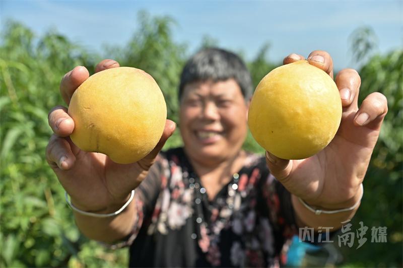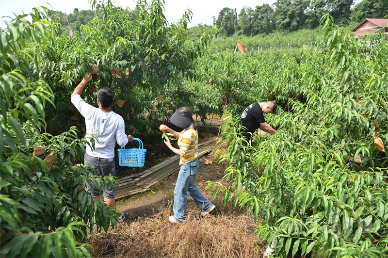 6月5日上午,记者走进内江市东兴区鹰桃缘水果种植农场,成片桃园枝繁叶茂,拳头大小的黄桃挂满枝头,黄澄澄的黄桃散发出阵阵果香,令人垂涎。不少游客穿梭桃园,感受摘桃乐趣。