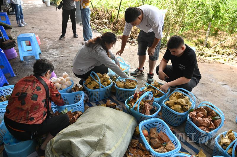 基地里,果农们忙着将刚采摘回来的鲜桃进行集中分拣、套袋、称重、打包,忙得不亦乐乎,现场一派热闹的丰收场景。