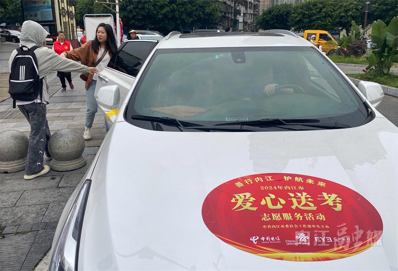 爱心送考车在市中区临江小区江城花园转盘处送考生
