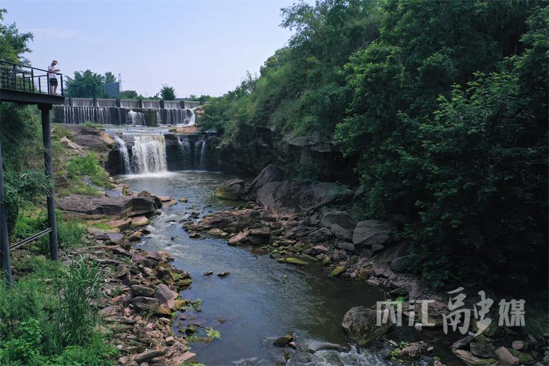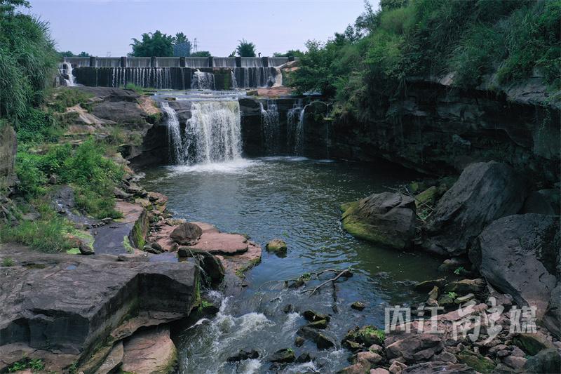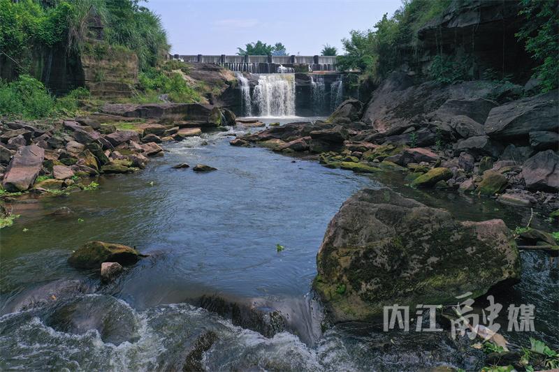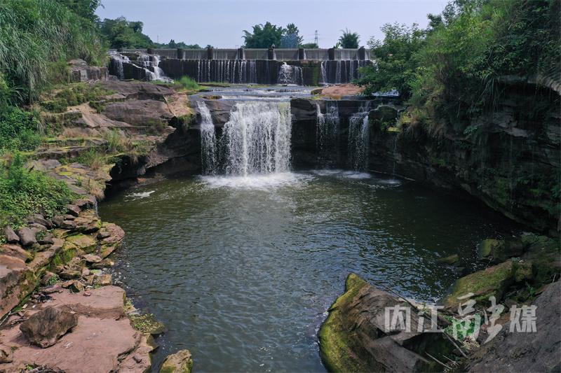 6月15日上午,记者走进位于内江市东兴区东兴街道陡坎村的陡坎瀑布看到,游人结伴而行踏过青石拦河坝,他们时而蹲下拨弄水花,时而站立眺望远方,时而举起手机与瀑布合影。