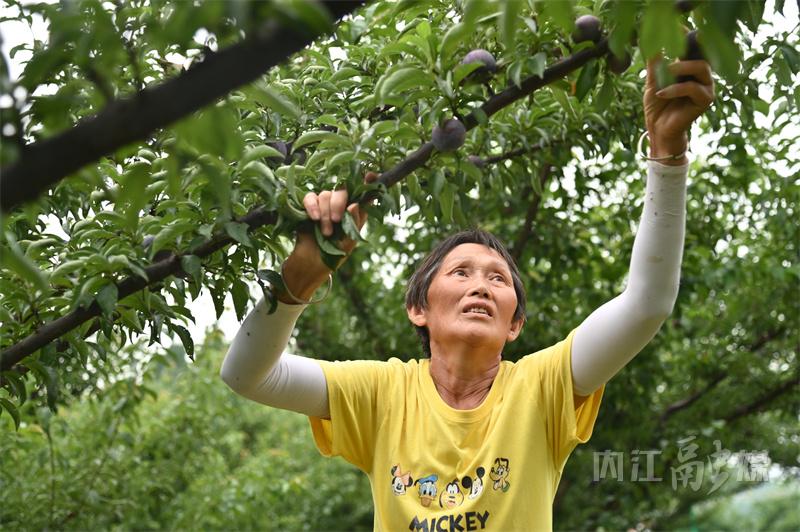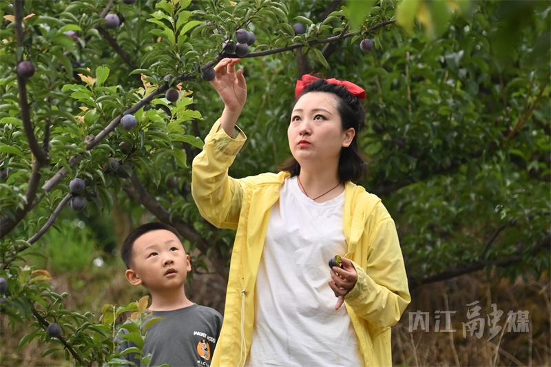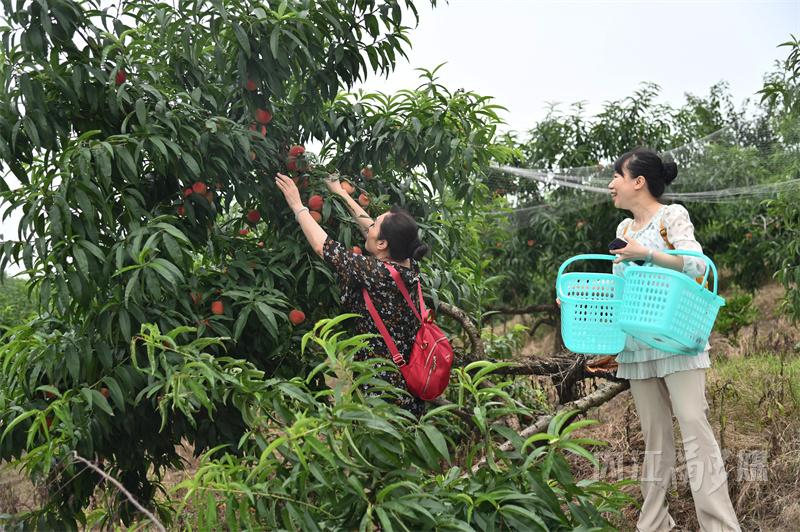 缤纷六月,桃李飘香!6月16日,内江市东兴区椑木镇红林村,游客正在果园采摘桃子和李子。