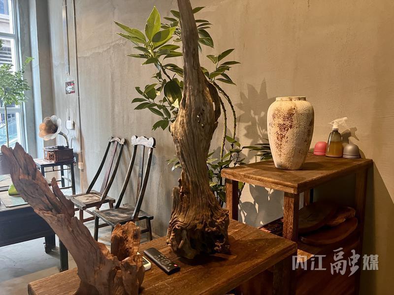 老式复古留声机、掉漆的中式桌椅、并不明亮的射灯,幸福树、龙须树、天堂鸟等绿植点缀其间……简单的装饰让店内的怀旧风扑面而来,简约之中凸显茶酒馆的调性。