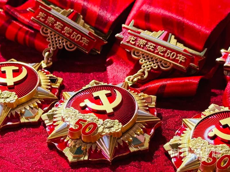 宣誓后,为退休支部和各村(社区)20余名党龄50年的老党员代表颁发“光荣在党50年”纪念章,对他们忠诚奉献、坚守初心、不懈奋斗表示肯定。颁发纪念章,进一步增强了老党员的荣誉感、归属感和使命感,同时激励新时代年轻党员在老党员的精神感召下传承红色基因、赓续红色血脉,立足本职工作,守初心、担使命。