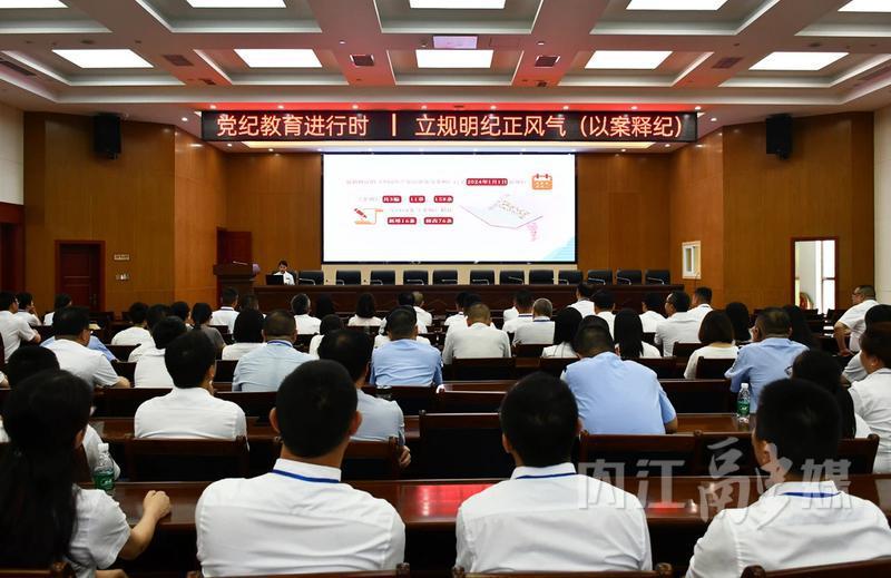 6月25日,内江经开区组织开展“以案为鉴警钟长鸣、以学促干守牢底线”主题党性党风党纪教育活动。在家区领导、调研员,区级各部门、镇(街道)班子成员,以及国企、教育、医疗、纪检监察系统副科级以上领导干部共计约100人参加。