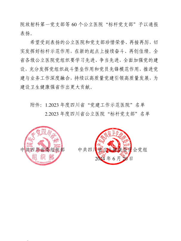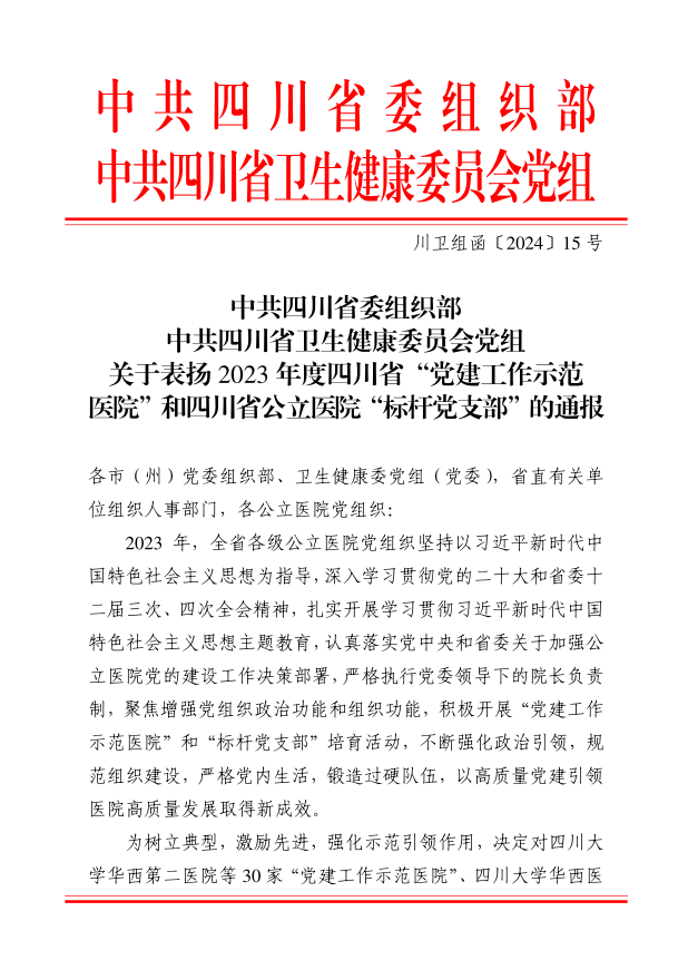 近日,四川省委组织部、四川省卫健委党组正式发布《关于表扬通报2023年度四川省“党建工作示范医院”和公立医院“标杆党支部”》的通知,内江市中医医院被授予2023年度“四川省党建工作示范医院”荣誉称号,成为2023年内江本地唯一一家获此殊荣的医疗机构。