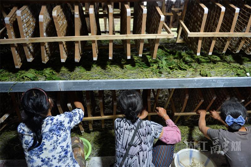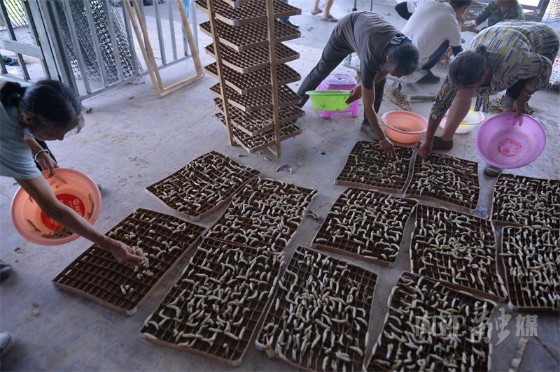 走进蚕棚,蚕农们正忙着养蚕、摘茧……方格蔟上,蚕丝在阳光的照射闪着光亮。“这是第三批桑蚕茧了,到11月,一共要养八批。”蚕农卓建伟告诉记者,去年他就在蚕棚干活,一个月有3000多元的收入,常年在这里干活的有30多人,都是本村的村民。