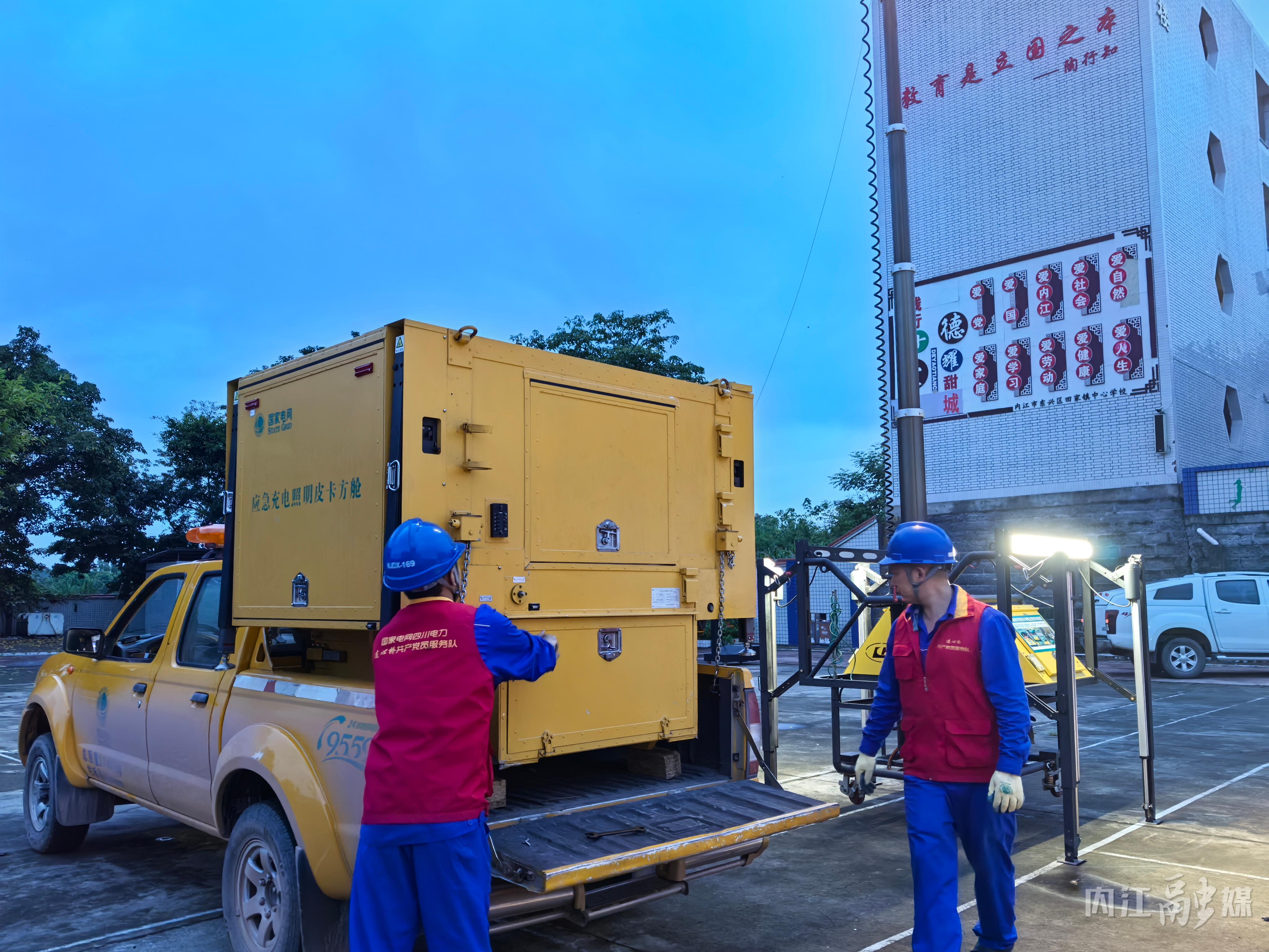 7月14日晚,国网内江供电公司东兴“三为”志愿服务队检查应急充电照明方舱和蜘蛛侠应急照明灯塔运行工况,为群众安置点提供安全可靠照明供电保障