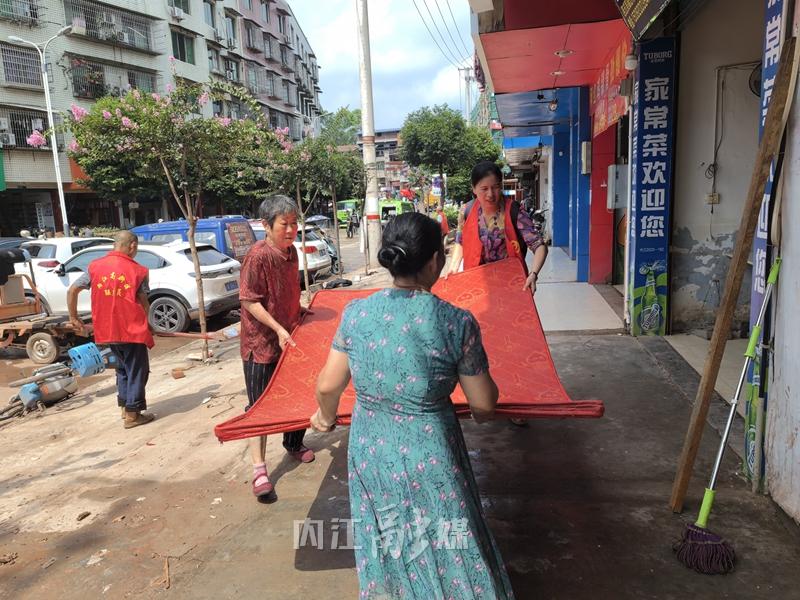 7月16日早上8点30分,内江高新区高桥街道场镇上,近90名党员干部、志愿者按照分工,继续坚守岗位,手拿铁铲对公共区域开展清淤、冲洗、消杀工作。洪水过后的高桥街道正有序恢复生产生活秩序。