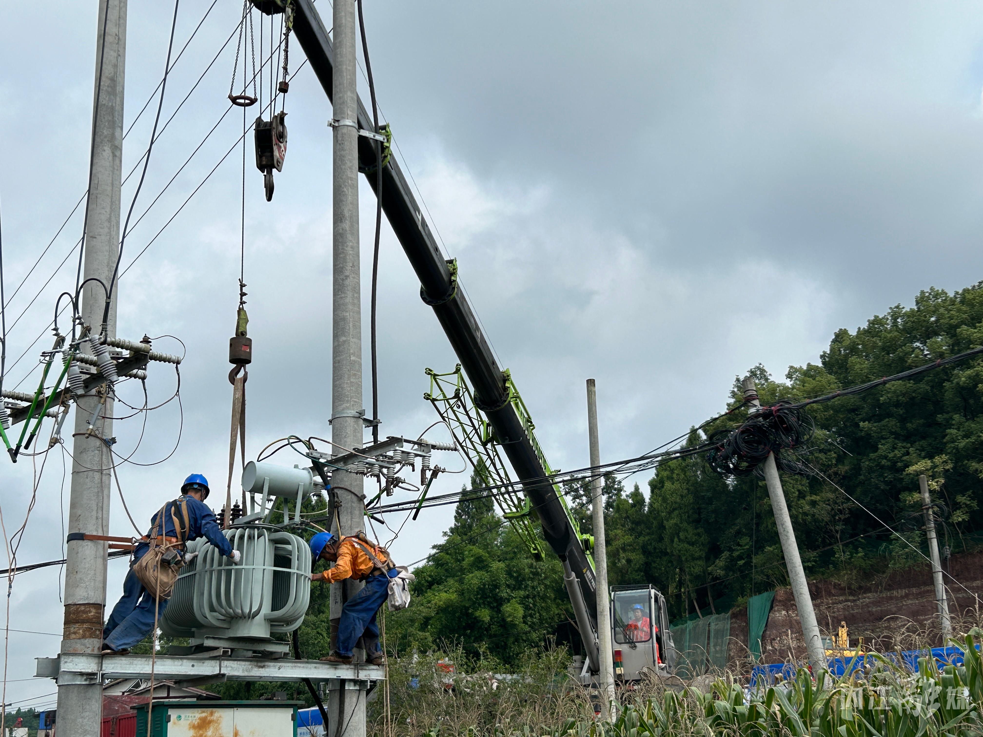 “往下放一点,稳住……”7月16日上午9时许,洪水消退后的东兴区田家镇正全力开展灾后恢复工作,东兴供电公司田家供电所电力人员也争分夺秒进行抢修作业。