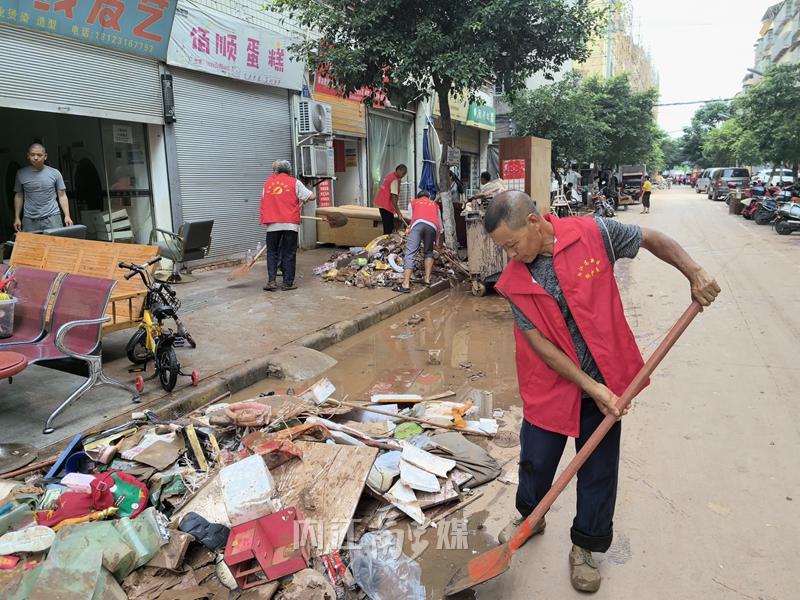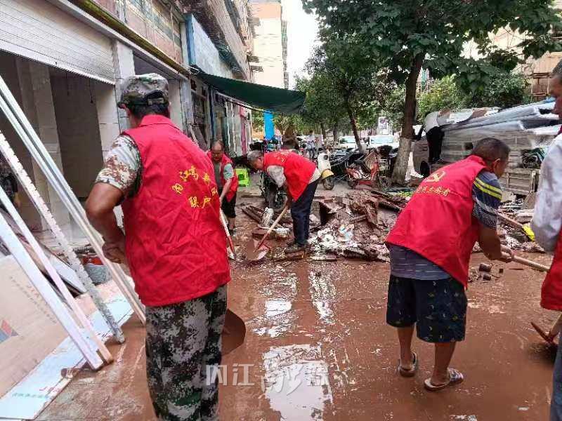7月16日早上8点30分,内江高新区高桥街道场镇上,近90名党员干部、志愿者按照分工,继续坚守岗位,手拿铁铲对公共区域开展清淤、冲洗、消杀工作。洪水过后的高桥街道正有序恢复生产生活秩序。