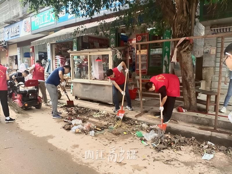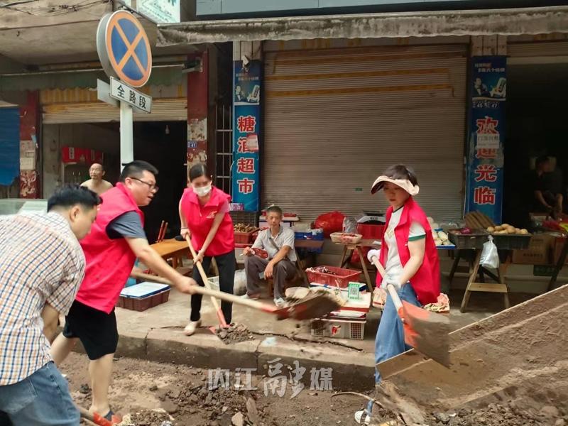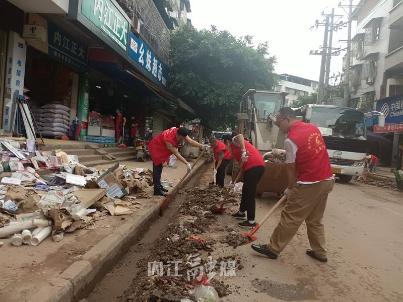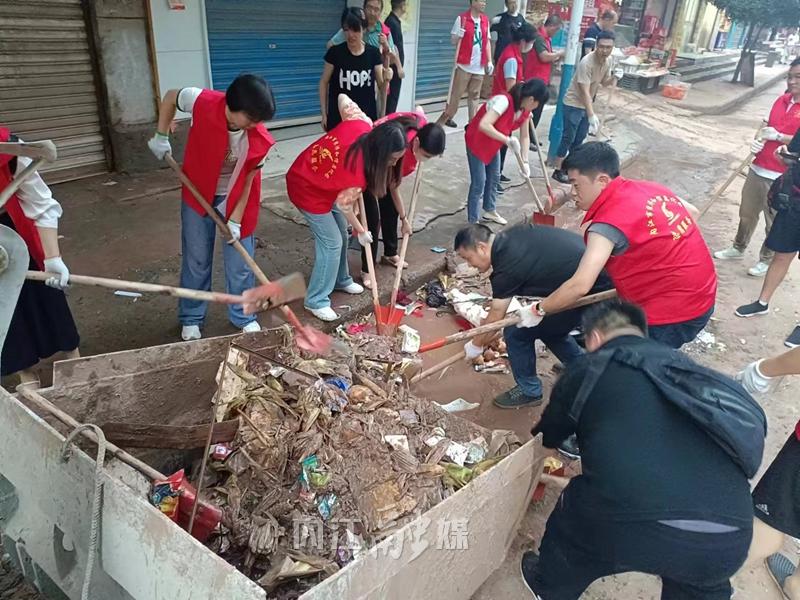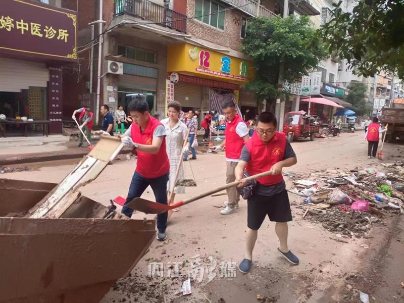 战斗清淤一线。7月16日16时,接到清淤任务后,20分钟内便完成集结,市经济和信息化局主要领导率党员干部攻坚队,于16时50分到达东兴区顺河镇,迅速投入清淤工作。全体攻坚队员迎难而上、挥汗如雨,全力以赴帮助受灾群众尽快恢复正常生产生活秩序。