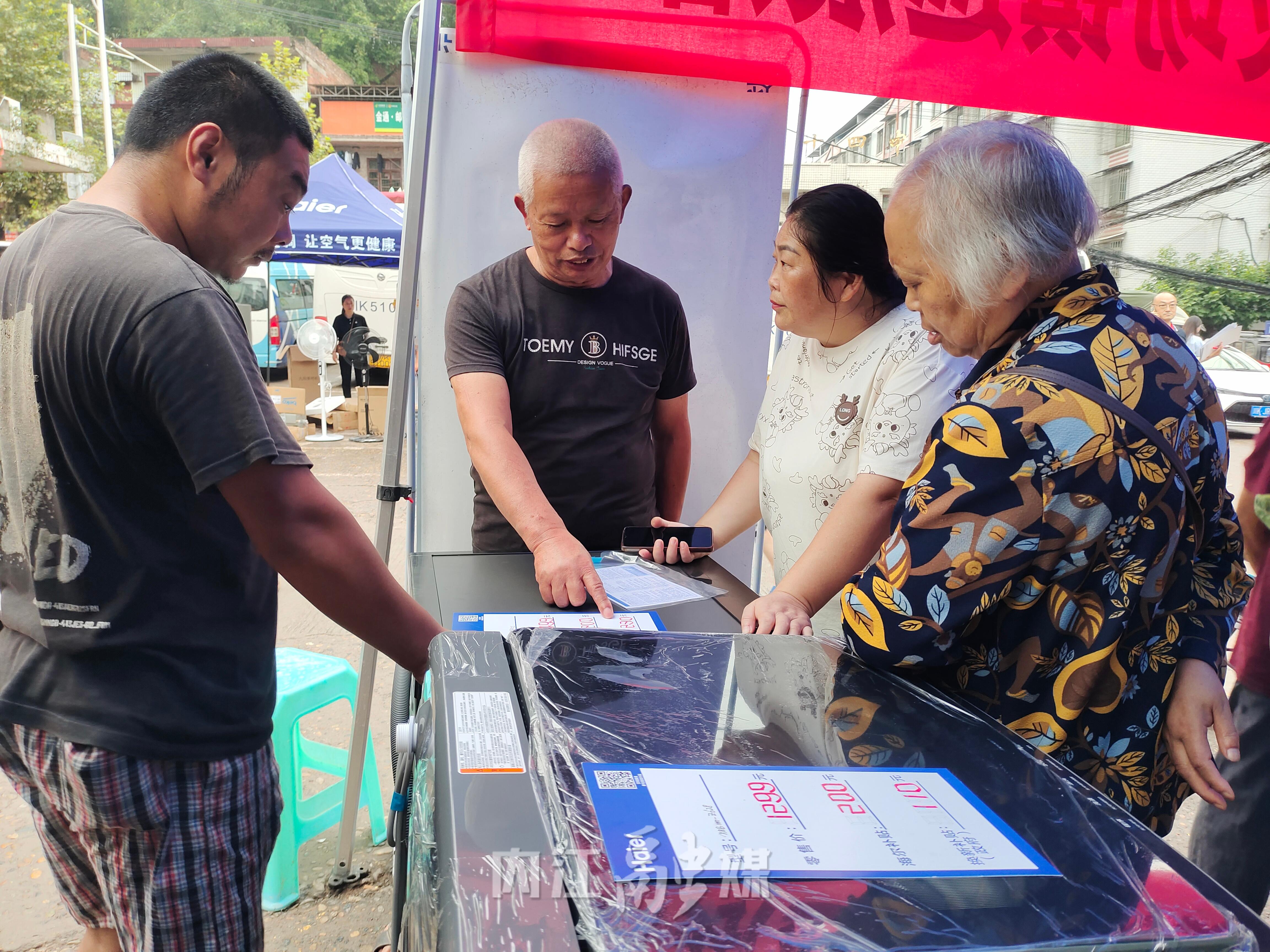 “老板,冰箱好多钱?”“补贴得到好多哟?”……在白合镇人民政府外,各种大小家电品类丰富,补贴政策与申领流程十分醒目,前来咨询、换购的群众络绎不绝。 一台原价2399元的洗衣机扣除公司补贴和焕新补贴后需近2000元。义卖商品电热水壶60余元、电饭煲一年内损坏包换等好价商品和完善售后服务受到群众欢迎。“这个政策很好,活动优惠幅度很大,我要把这个消息告诉邻居、朋友,赶紧把暴雨时被水淹了的家电拿来换。”群众段精淦说。