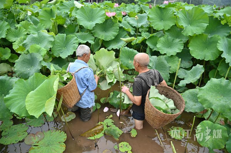 另一边,有村民正背着背篓采摘新鲜的荷叶制作荷叶茶。
