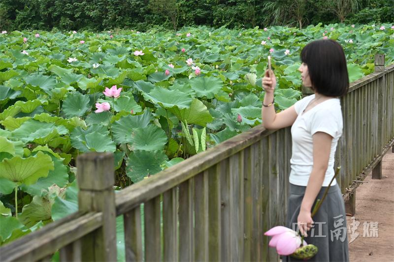 荷塘中,有游客漫步于观景凉亭和木质步道间,忍不住拿起手机记录独属于荷花的美。
