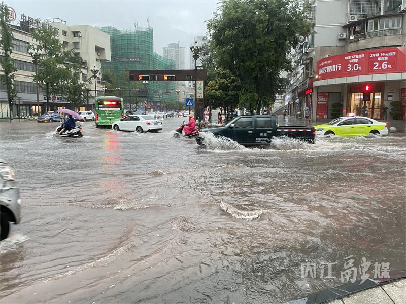 7月20日上午,记者在内江东兴区城区部分路段看到,受短时强降雨影响,路面出现了不同程度积水,其中严重路段路面积水已淹没人行道。