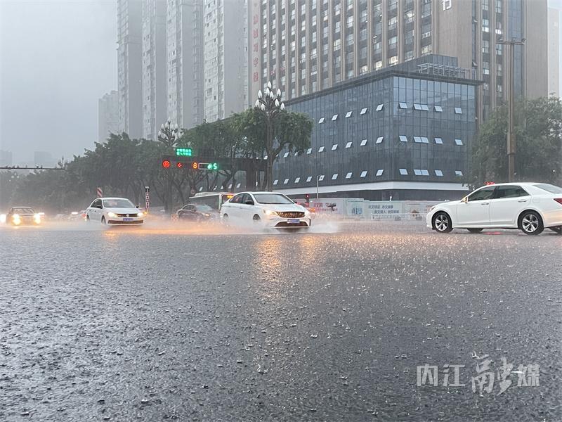 在西林大道与汉安大道交叉口,降雨持续增大,路面出现积水,道路中间,一名交警坚守岗位,道路车流量不大,车速缓慢。随后,记者沿着西林大道行至西林大道与兴隆路交叉口(原内江市妇幼保健院斜对面)处看到,该处为“丁”字形路口,道路积水已经快要漫上人行道,轿车在通行该路口时,积水几乎淹没车轮。