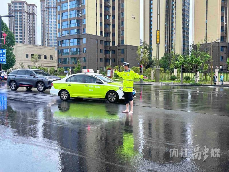 7月20日,内江受短时强降雨影响,路面出现不同程度积水。上午11时许,记者在东兴区东城路看到,该路段路面积水较多,东兴区交警正在路面执勤,积极开展交通疏导,指挥车辆有序通行。