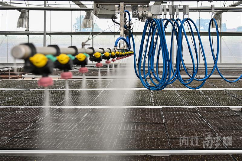 喷淋、控温、育苗、间苗……记者现场看到,大棚内,工作人员正在进行辣椒、黄瓜、花菜的育苗工作,在育秧机、温控系统和喷淋装置等智能化设备的“加持”下,整个生长过程所需要的营养、温度、湿度和水分等全部智能化控制,实现了集约化、生态化生产。