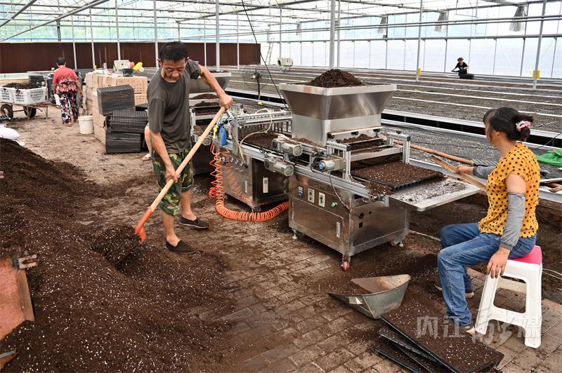 7月29日,内江市威远县向义镇水口村精品蔬菜育苗基地,工作人员正在进行蔬菜的自动化育苗。