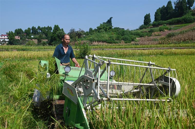 8月2日,在位于内江高新区胜利街道前进社区的一片稻田里,伴随着“轰隆隆”的机鸣声,农机员正驾驶收割机穿梭于田间,开足马力快速作业,呈现出一派忙碌的丰收景象。