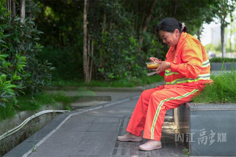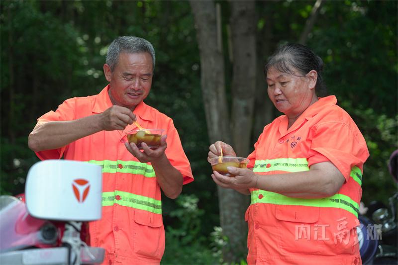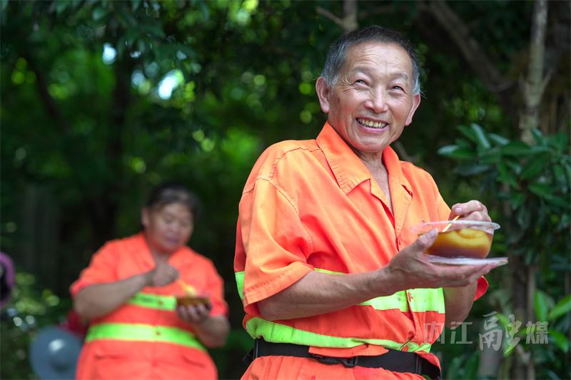 “谢谢你们的关心,我们会做好本职工作,让城市变得更加干净整洁。”环卫工人陈玉双一边吃着凉糕一边感激地说。