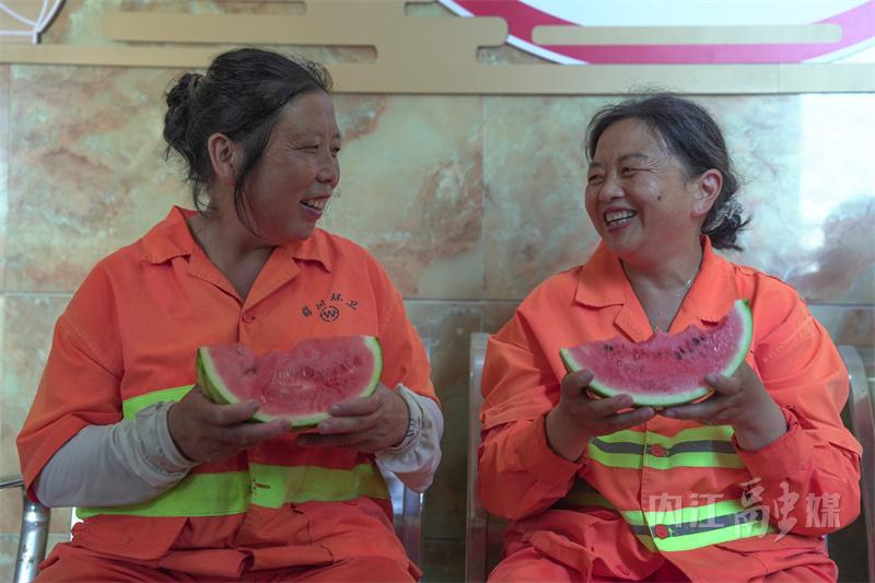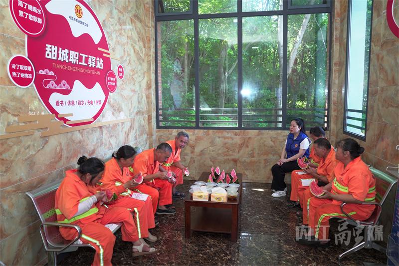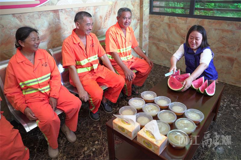 8月8日,在位于内江市东兴区兰桂大道的“甜城职工驿站”,来自内江市东兴区总工会的工作人员为环卫工人送去西瓜、凉糕、冰粉等夏日清凉食品,为坚守在一线岗位上的环卫工人们送去丝丝凉意和浓浓关爱。
