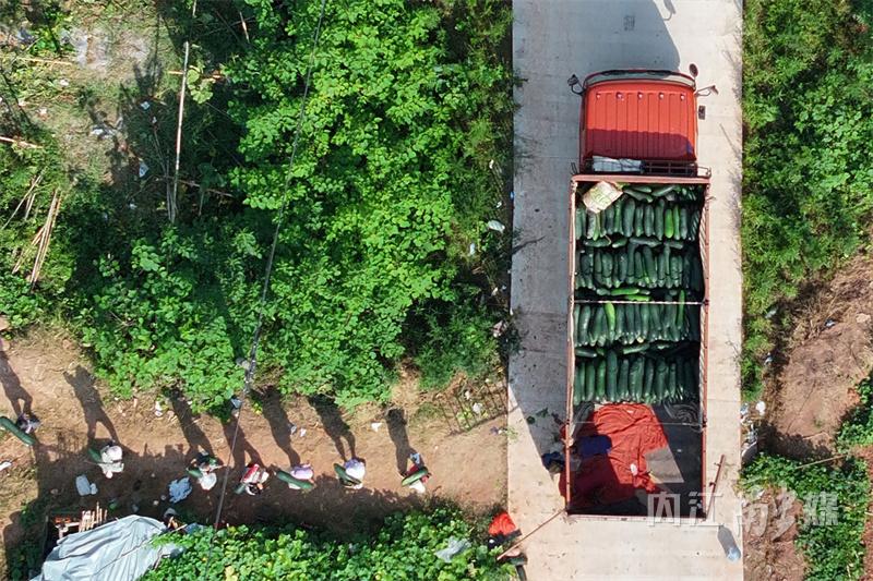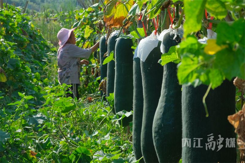 8月16日,内江市东兴区平坦镇晒鱼村,村民们在种植基地内采收黑皮冬瓜。