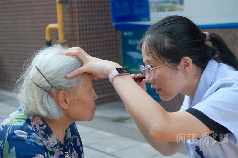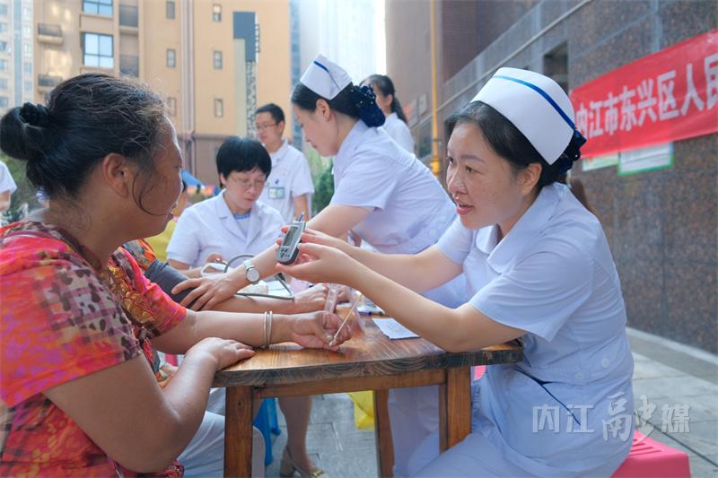 8月20日,内江市东兴区东兴街道607社区,医务志愿者为居民测量血糖。