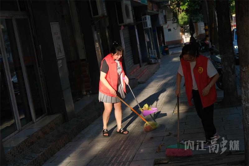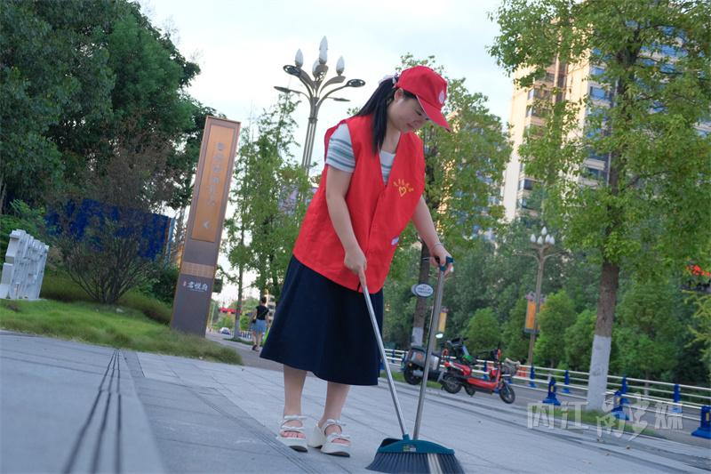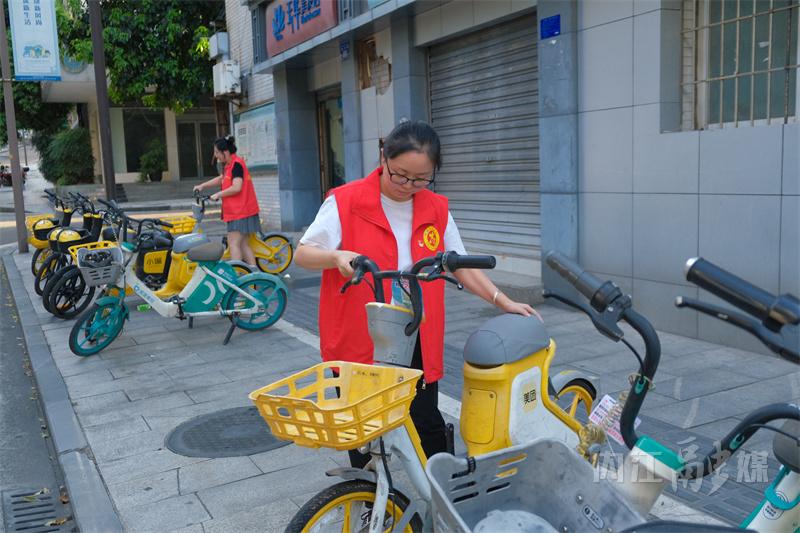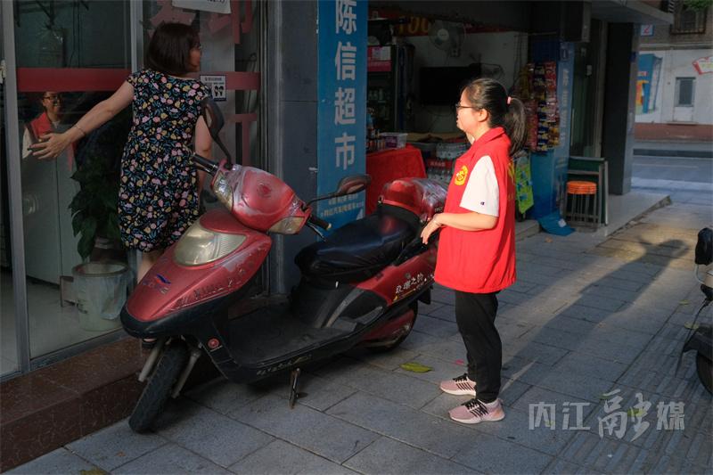 在市中区翔龙路二巷,内江市科协的刘馨遥和同事正开展沿街巡逻、卫生维护、规范共享单车停放等志愿服务工作。在烈日的照耀下,刘馨遥的脸被晒得通红,脸上挂着大颗的汗珠。