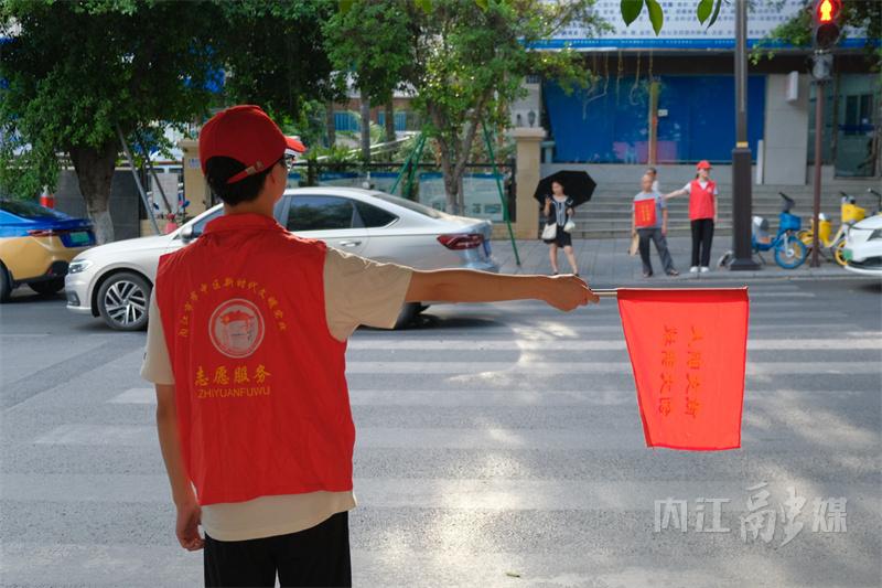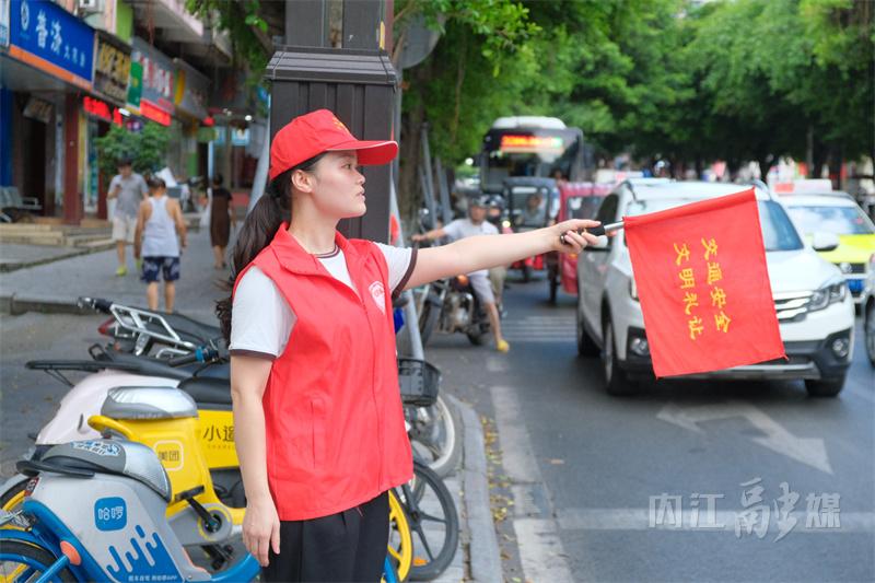 当天下午5点,市中区南环路与江华街交叉路口人流如织。内江市气象局的志愿者周燕平和同事挥舞着手中的小旗子,引导行人遵守交通规则,文明过马路,酷热的天气丝毫没有影响到志愿者们高昂的服务热情。