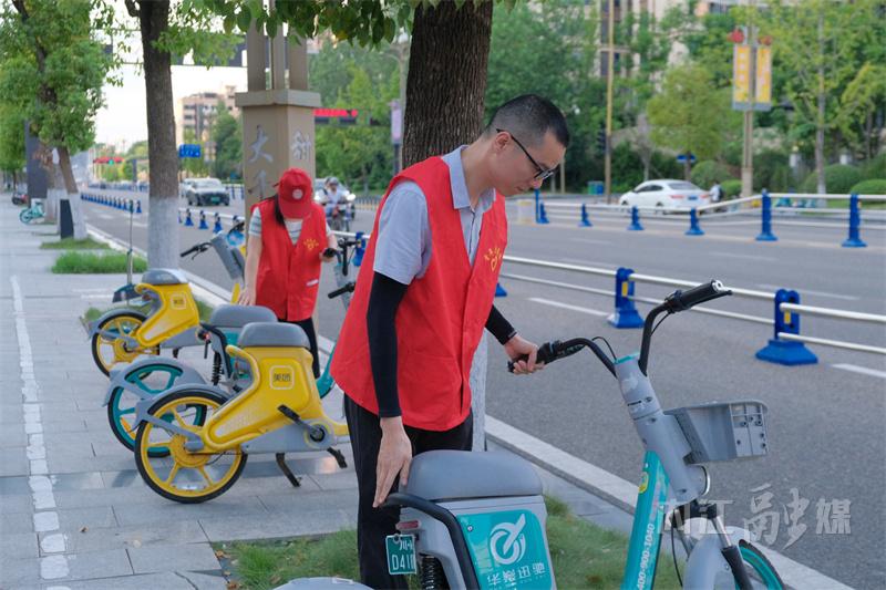 在市中区石羊大道,内江市统计局的志愿者陈悦同样忙碌在志愿服务岗位上。他们身穿红马甲,沿着街道一路巡逻,开展规范共享单车停放、卫生维护等志愿服务。